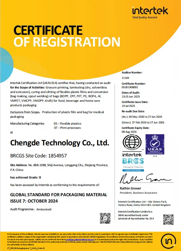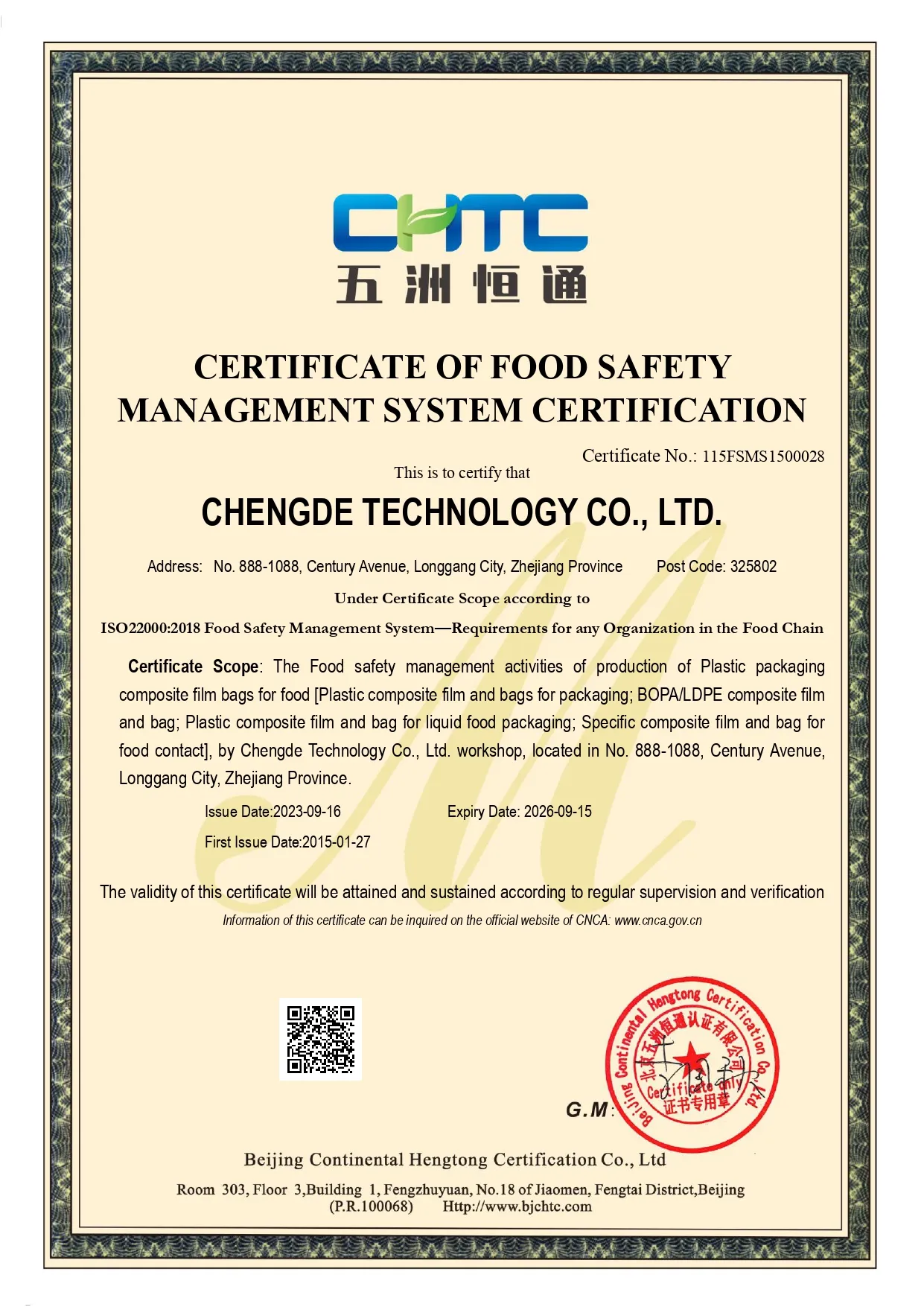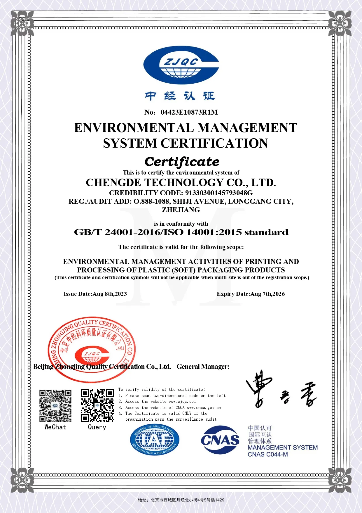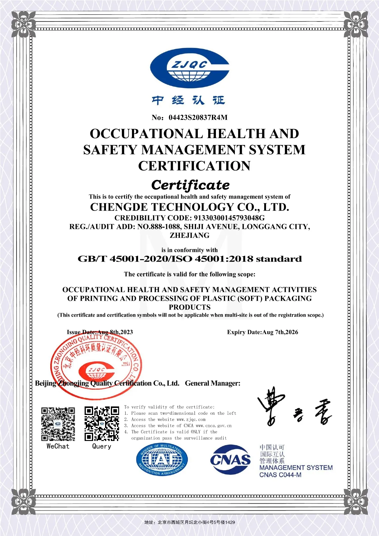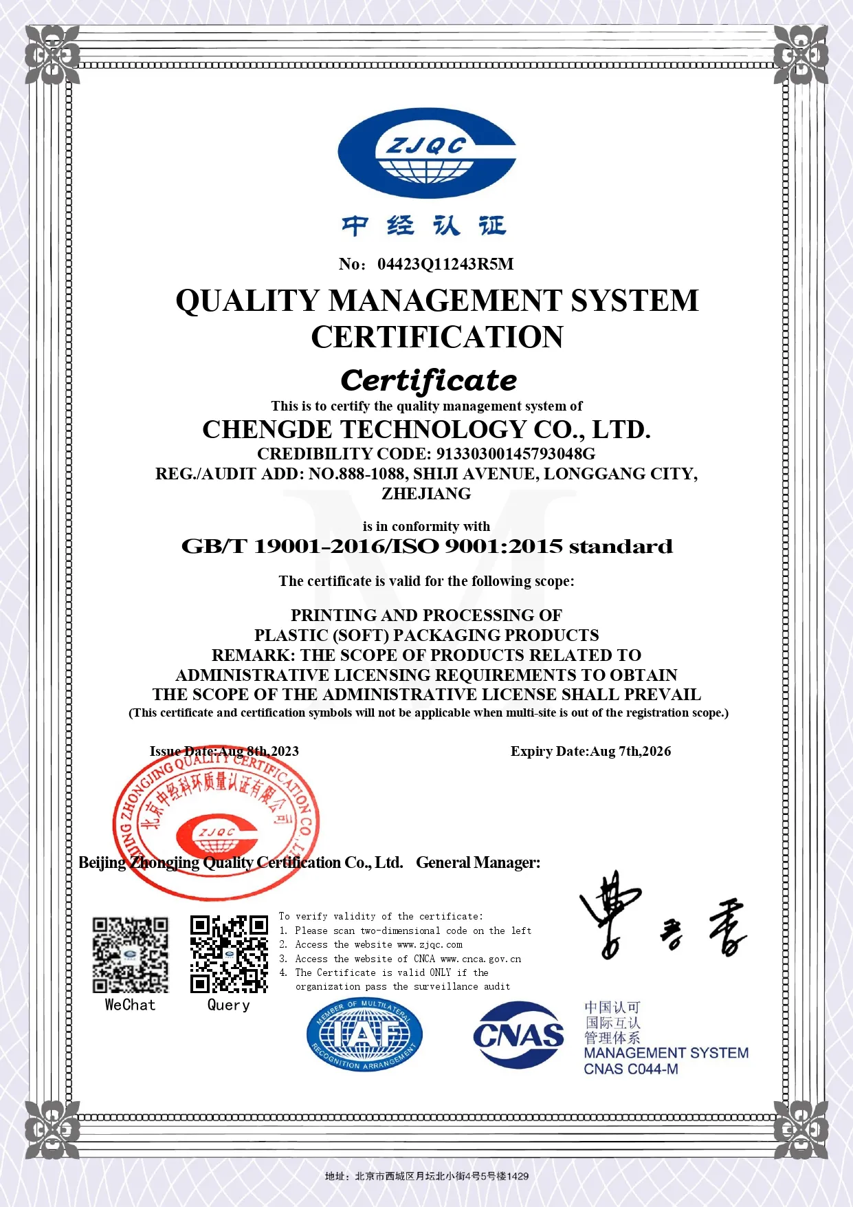 Chengde is one of “China's Functional Polyethylene Flexible Packaging R&D Center” and has a total of 94 patents, issued and implemented "self-standing ziplock bag", "Polyamide, polyethylene composite liquid packaging film and bag" "Made in Zhejiang" standards. The company has been honored as "China's Top 100 Packaging Enterprises” ,“China's Top 10 Innovative Packaging Industry”,etc.