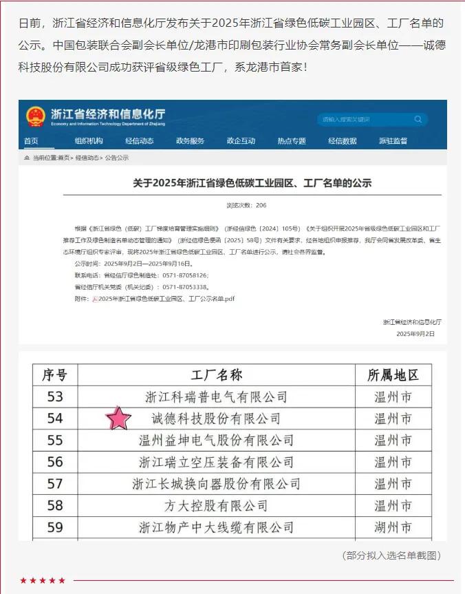 Recently, the Zhejiang Provincial Department of Economy and Information Technology announced the list of provincial-level green and low-carbon industrial parks and factories for 2025. Chengde Technology Co., Ltd.—a vice president unit of the China Packaging Federation and standing vice president unit of the Longgang Printing and Packaging Industry Association—was successfully recognized as a provincial-level green factory, making it the first in Longgang City!