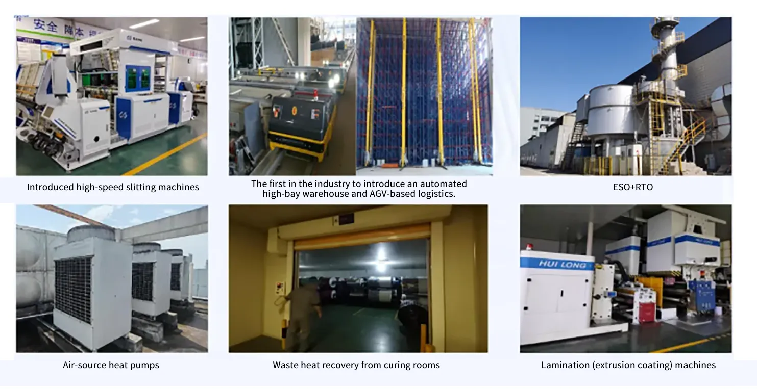 In recent years, Chengde Technology has implemented multiple energy-saving, carbon-reduction, and water-conservation upgrades. These include the construction of a 1,980 kWp distributed photovoltaic power station (with a total power generation of 2.46 million kWh in 2024), the introduction of new slitting machines, regenerative thermal oxidation (RTO) technology for treating mainstream organic waste gases, and automated storage systems. Additional improvements encompass composite process upgrades, optimization of slitting and winding processes, enhancements in product debugging procedures, improvements in surface winding, waste heat recovery and utilization, adoption of air-source heat pumps, development of single-material solutions, and the use of eco-friendly packaging materials.
