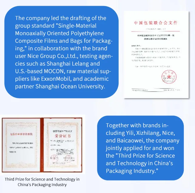 Chengde Technology led the drafting of two group standards, including the "Single-Material Uniaxially Oriented Polyethylene Composite Film and Bag for Packaging." These standards were developed in collaboration with brand partners such as Nice, testing institutions including Shanghai Lelang and MOCON (USA), raw material supplier ExxonMobil, and academic institutions like Shanghai Ocean University. Additionally, Chengde Technology jointly applied with leading brands such as Yili, Strong, Nice, and Be&Cheery and was awarded the "Third Prize of Science and Technology in China's Packaging Industry.